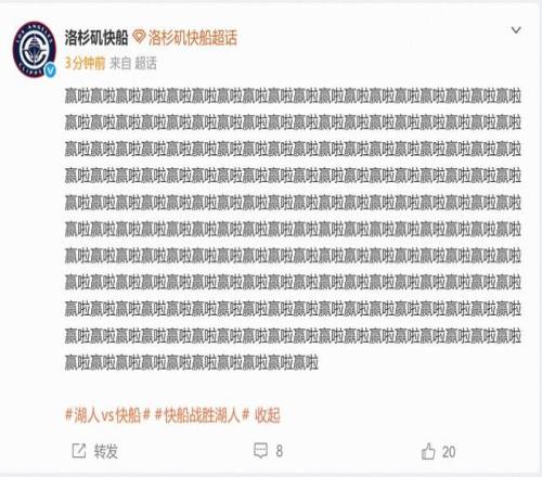 赛后,快船官方媒体在社媒上连发190个“赢啦”庆祝胜利。
