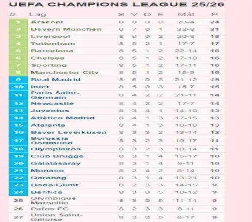 联赛阶段积分榜上,阿森纳以24分领跑,拜仁慕尼黑21分紧随其后。前8球队直接晋级16强,包括阿森纳、拜仁、利物浦、热刺、巴塞罗那、切尔西、里斯本竞技和曼城。第9至24名球队将通过附加赛争夺剩余8个16强席位,比赛将于今年2月17日和24日进行。特鲁宾的进球被多家媒体誉为“门将史上最佳进球之一”,为本赛季欧冠增添了传奇色彩。随着联赛阶段落幕,欧冠淘汰赛的硝烟即将点燃,各队将为最终荣耀展开激烈角逐。